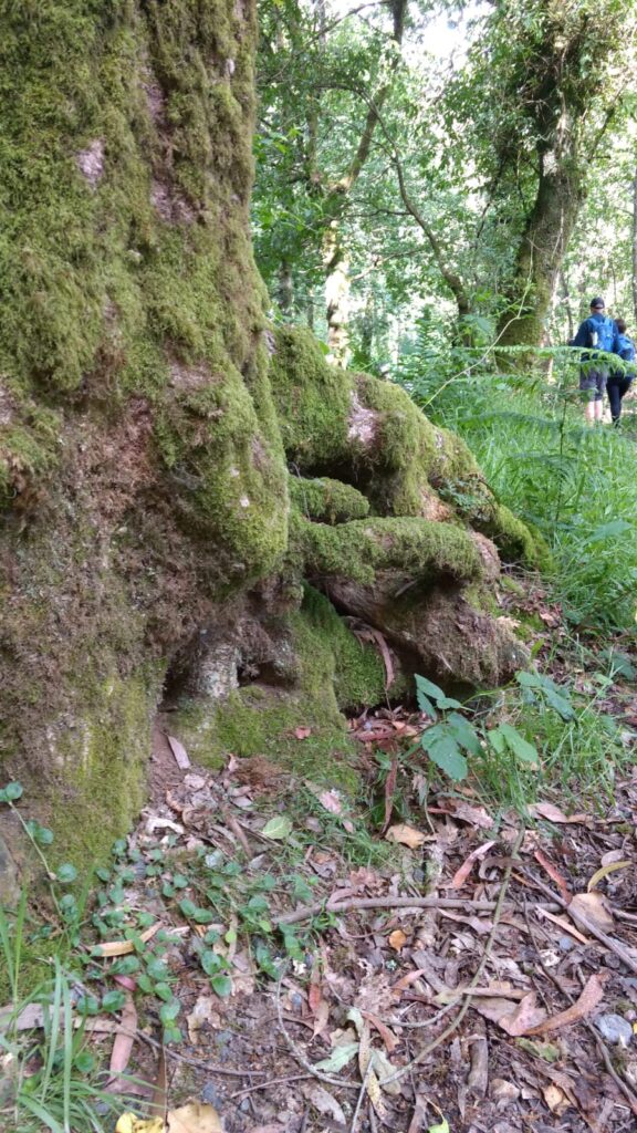 Comenzamos a caminar hacia Arzúa (16 kms) entre robles y castaños, por tierra prieta. Está nublado, sopla el viento y en algún momento, al parar, uno ha de protegerse.