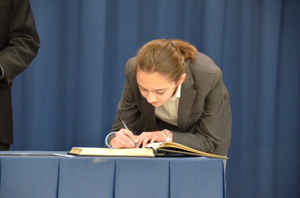 Después de estas palabras, el P. Juan Antonio Granados, dcjm junto con D. Germán Menéndez (coordinador del Departamento de Ciencias) ha entregado el diploma ganador de la Categoría II (ESO) del II Certamen de Fotografía Científica y Matemática a Julia Montoro Andriesei (2º ESO A). Con motivo de este galardón, la alumna ha firmado posteriormente en el Libro del Director.