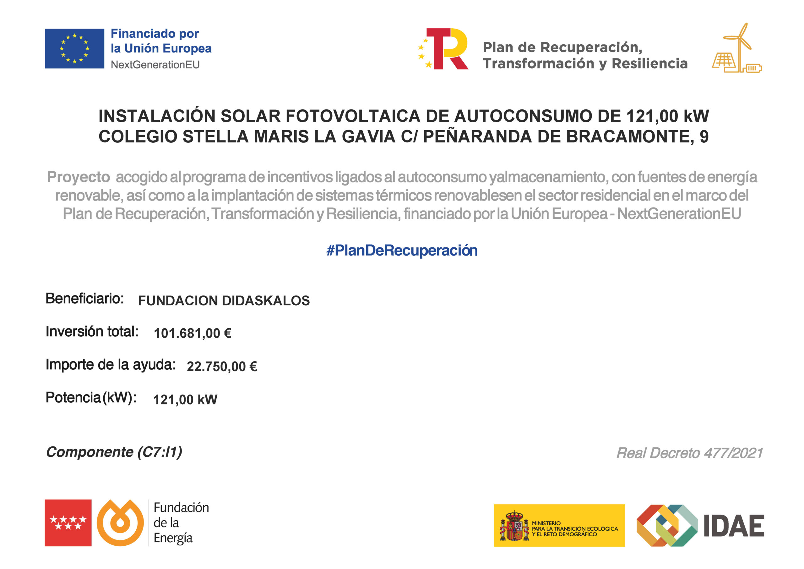 El colegio Stella Maris la Gavia dispone de los fondos de este plan de recuperación para la Instalación Fotovoltaica de Autoconsumo con una Potencia (kW) de 121,00 kW